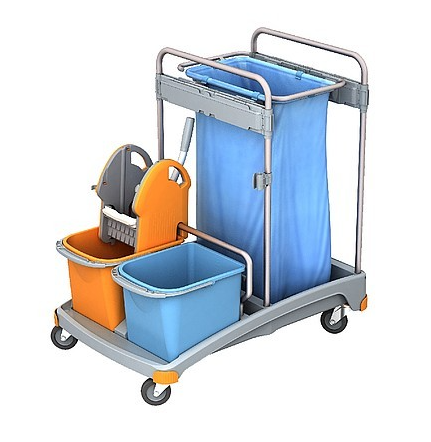 Wózek serwisowy TSS-0001 z tworzywa sztucznego ABS wyposażony w dwa wiadra o pojemności 20 litrów. W skład zestawu wchodzi dodatkowo uchwyt na worek 120litrów. Wszystko zamontowane na stabilnej konstrukcji z tworzywa sztucznego ABS. Wózek posiada cztery kółka o średnicy 100mm pokryte gumą co zapewnia ciche przemieszczanie.