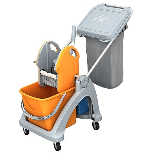Wózek z tworzywa sztucznego marki Splast wyposażony w jedno wiadro 25L pomarańczowe, małe 6L wiaderko w kolorze niebieskim oraz 60L worek na odpady. Wózek ten jest idealnym zestawem do sprzątania dużych i małych powierzchni. Wózek wyposażony jest w bardzo dobrej jakości prasę umożliwiającą dokładne odciskanie z wody mopa.